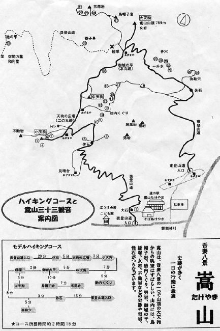 嵩山は、吾妻八景の一つで山頂の大天狗からの眺望はすばらしい。山内には、烏帽子岩、胎内くぐり、男岩、御城の平、経塚、女岩、不動岩などの史跡や奇岩、怪石がつらなっています。(道の駅「嵩山」で配布しているパンフレットより)。