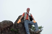 さてここから大天狗への登りが本コースのハイライトである。長い鎖が岩に取り付けられている。斜度はキツくないが濡れているので神経を使う。鎖の先端〜頂上〜は全く見えないほどの岩の連続である。ニ連ほどの鎖をこなすと、岩陰にヤマユリが奇麗に咲いている。さらに数連の鎖に縋って登ると頂上直下の平坦地に出た。すぐに頂上に立つ(915)。頂上には大きな岩が乗っかっており、この岩にも鎖が設置されていたのでヨイショっと岩の上にたった。