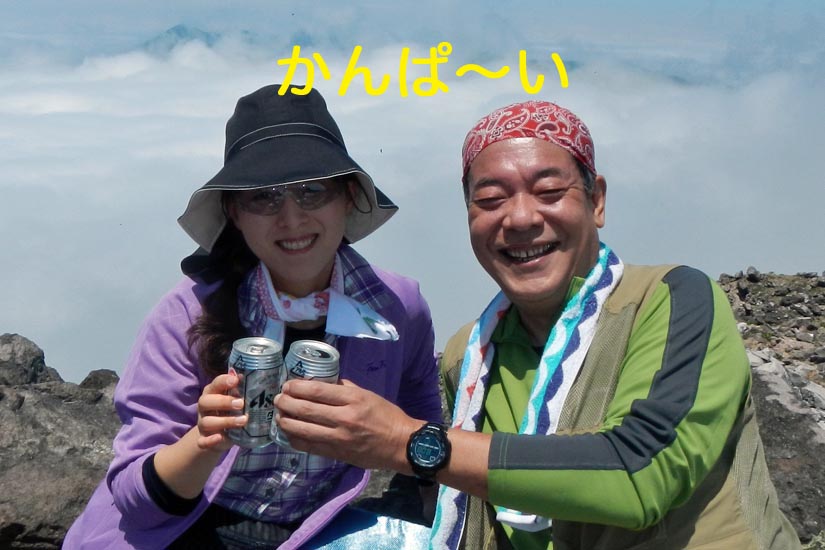 記念撮影をして10時出発。茶臼岳まではわずかな距離だが、登山道は急坂の上に石ころや砂礫が多く歩きにくい。不安定な足下に注意しながら行くと、岩の多い道に変わる。ここを登り切ると緩やかな山頂地帯に入るが、メンバーの登山靴が壊れてしまった! 靴底が剥がれてしまい、パクパクしている。ともかく山頂まで我慢して歩け、と気合いを入れるが、すぐにもう片方の靴も同様に壊れ、一方は完全にソールが剥離してしまった。仕方ないので筆者が常備している替えの靴ひもで縛りソールを仮固定。何とか歩ける状態とし山頂へ(1054)。ここで昼食休憩。Tさんが冷えた缶ビールを担ぎ上げてくれたので、まずは乾杯!昼食はソーメンを茹で、参鶏湯スープで食べる趣向。ゆっくりコーヒーを飲み1210出発、茶臼岳噴火口を一周し、峰の茶屋避難小屋目指して下る。この場所は今回ルートの要となるポイントで、明日もここまで戻ってくる予定である。