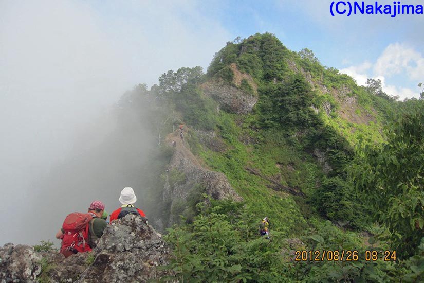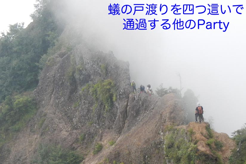 さて、いよいよ蟻の戸渡りだ。幅50cm、長さ20mの下り気味の痩せ尾根。左側は垂直に切れ落ちている。右側には数メートル鎖で下りて蟻の戸渡り部分をエスケープできるルートが作られている。迷わずエスケープルートを選択。しかし鎖を下降するのも緊張する。慎重に下ると今度は鎖に掴まりながら真横への移動。さらに登って再び稜線に出る。今度は剣の刃渡りだ。ここは幅30cm、長さ2mのまさにナイフリッジで、エスケープルートはない。前の人に倣い、尾根に馬乗りに跨がってズリズリ進む。格好悪いが気にしている場合ではない。下を見ないように、岩だけ注視して進むと左下方に足場があるので、そこへ降りれば刃渡りは終わる。全員無事に通過し、その後も片側が切れ落ちている岩壁上部を慎重に歩き842八方睨(はっぽうにらみ)着。緊張が解けて疲労感が増強した感じである。タイミング悪くガスが出てきて眺望は得られない。小休憩して出発。振り返るとナイフリッジ部を攻略している登山者が良く見えるが、大半は馬乗り戦法や四つん這い戦法で通過している様子である。戸隠山には906到着。その後は尾根歩きであるが、アップダウン激しく体力消耗する。筆者は休憩の度に座り込む始末で本当に疲れた。1054ほうほうの体で一不動避難小屋に到着、昼食休憩としたが、疲れのためか弁当が喉を通らない。無理して半分ほど食べ1120出発。ここからは沢筋を下るのみ。しかし戸隠山は甘くなく、数カ所のクサリ場が待っていた。途中の「氷清水」という湧き水が冷たくて滅法美味しい。これで息を吹き返し、慎重に下山、1216戸隠牧場に下り着いた。