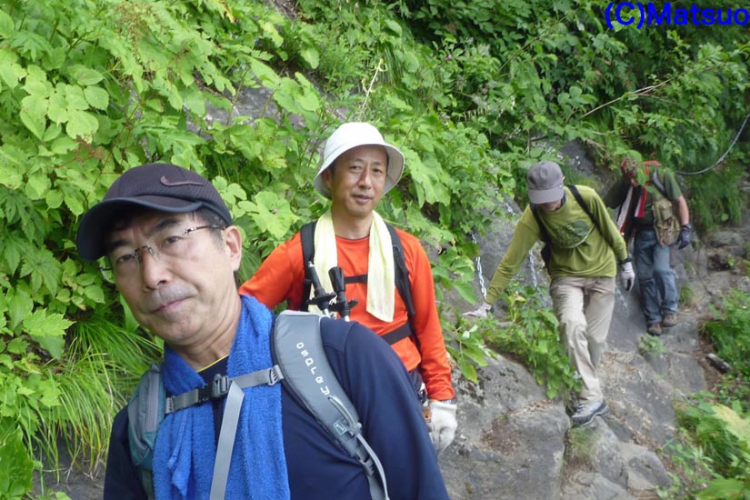 登山道は始めから急坂である。先頭の隊長はドンドン先に行くが筆者はすぐに息が上がってしまい、足取りが重くなる。高度が上がるにつれ岩稜が間近に見えてくる。その禍々しい姿を目にするも、あと数十分でそこに立つという想像力が働かない。百間長屋と名付けられた岩の窪みを過ぎるとクサリ場が現れる。ここは20mほどの鎖だが、傾斜は緩く足場もしっかりしているので難なく通過。次は30mの岩場を三連のクサリで登る。最初はホールドの少ない箇所を斜めに登る。二番目の鎖はほぼ水平に岩壁をトラバース、最後の鎖を70度位の斜度で登る。前を行く二人の行動が大いに参考となる。さらに15mのクサリ場。ここはむき出しの岩壁で高度感があり怖い。しかし手がかり、足がかりは豊富であまり苦労なく登れる。上部は右方向にトラバース。ともかく下を見ないように心がける。登り切ると遭難碑がありイヤな気分である。