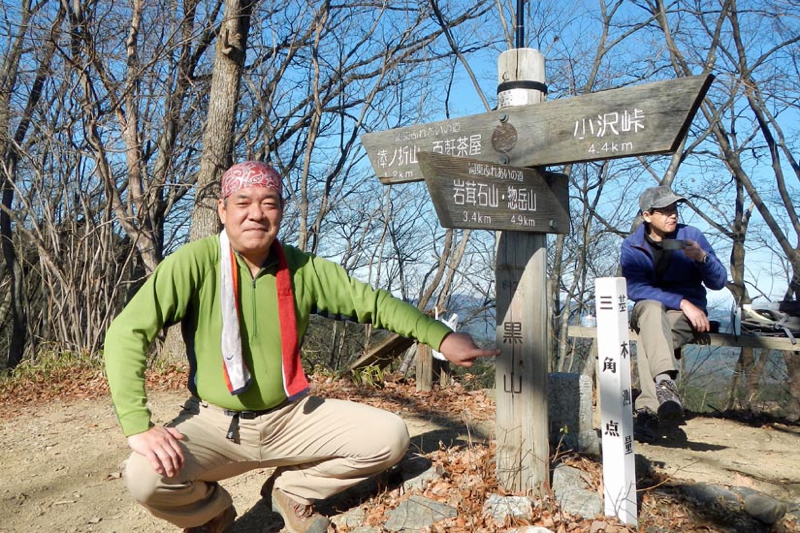 筆者の住む坂戸から川井駅までは、東武東上線・川越線・八高線・青梅線と乗り継いで二時間以上を要した。川井駅にてメンバー集結しバスに乗車、八桑BSにて下車(937)、目の前が登山口である。伐採地で間伐材を運搬している作業の横をすり抜け山に入って行く。沢沿いの道は山腹を巻くようになるが結構斜度がある。1041名坂峠着。岩茸石山まで0.1Kmとの標識があったので寄って行くこととしたが、かなりの急坂を登らされ1050山頂着(先程の0.1Km標識は怪しい)。天気良く、山頂からの見晴らしが素晴らしい。日光男体山やスカイツリーなどが見える。一服して来た道を引き返す。このルートは高水三山を歩くメインルートで明瞭だ。