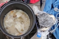自宅で用意してもらったおにぎり(1ヶ)と豚汁。豚汁は魔法瓶に入れて持参し鍋で加熱して食べた。野外で昼食としたが風が無く暖かい食事で元気を取り戻した。この他にカップラーメンも持っていたが、これは食べずに持ち帰り。