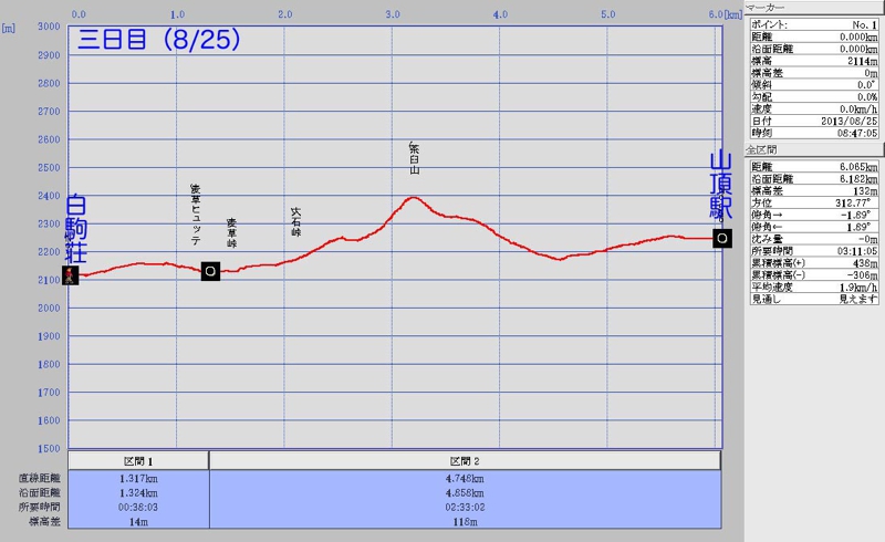 この先のルートを検討し白駒池まで降りることとし、白駒荘に連絡すると幸いにも個室が予約できた。黒百合ヒュッテから中山峠、中山、高見石を経由し1520白駒荘に到着。