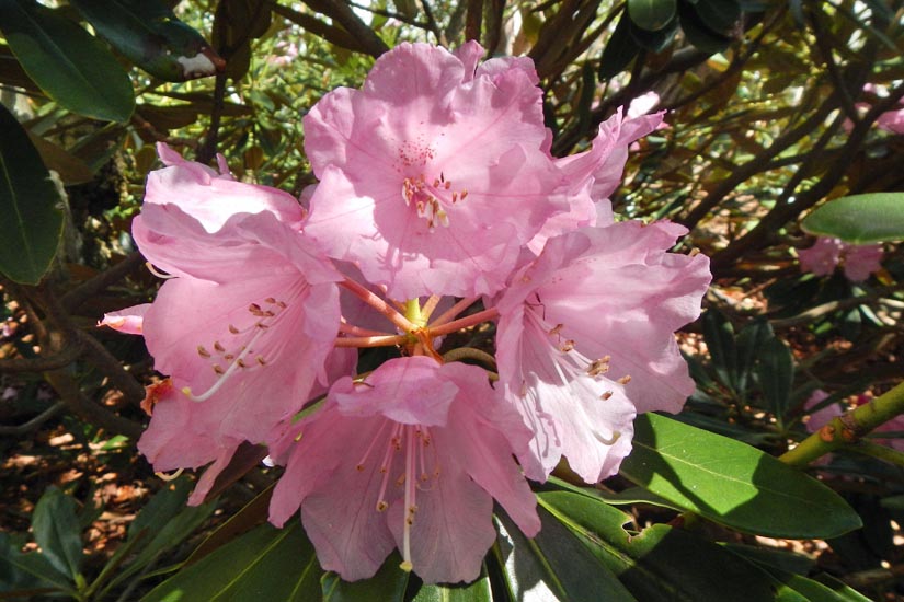 高槻を5時前に出発し、登山口近くの「イン谷口」に615到着。早朝の湖西道路はガラガラで走りやすい。適当な空き地に駐車して634歩き出す。少し下って道を辿ると荒廃した別荘地を通る。その裏手を登って行き、711ノタノホリに着く。ここは標高450mにある池で、モリアオガエルの産卵が見られる場所らしいが時期が早い。平坦な道をしばらく歩くと沢沿いの急傾斜となる。沢を詰めて行き、最後はジグザグの急登で尾根に出る。尾根に出てからも急登は続き、木の根や岩に掴まらないと登れないほどである。途中から現れるシャクナゲで気が紛れる。843堂満岳山頂着。頂上からは南東方面の眺めが良く、琵琶湖を見下ろすことができる。