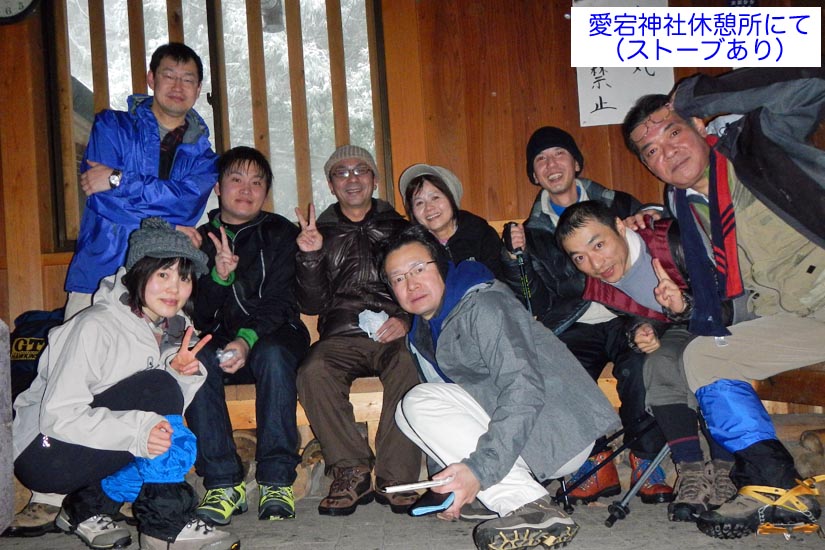 実は40/40標識は山頂ではなく、ここから社務所のある平坦な道を進むと最後の石段が待っている。長い石段を登ると左折して、最後の石段へ(955神社着)。休憩所には薪ストーブが燃えており助かる。神社に参拝し「阿多古祀符」を戴く(小サイズ一枚400円)。小休憩してからアイゼンを装着し1025下山開始、水尾分かれにて直帰するメンバー二名と別れ、残り七名は水尾の里へ。下山と同時に雨が降り出す(天気予報通りだ)。