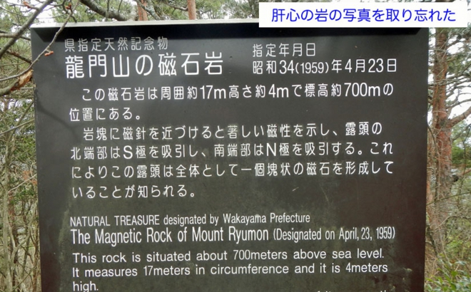 途中、コースから外れて「ちりなし池」を見物に行くが、池は黒く淀んで汚い。ここから本道に戻る際、道を間違え10分ほどロス。緩やかに高度を上げ、841田代峠に出た。峠からの尾根歩きは快適で道標も完備している。908磁石岩に着く。岩は磁性を帯びているとの説明看板を読み、iPhoneのコンパスアプリを立ち上げて調べてみると、なるほど岩に近づくと指針が30度ほど振れる。ここから5分ほどで龍門山に到着。天気は悪くないがスッキリした眺望ではなく、蛇行する紀ノ川が霞んで見える。山頂部は開放的な広い芝生広場で気持ち良い。