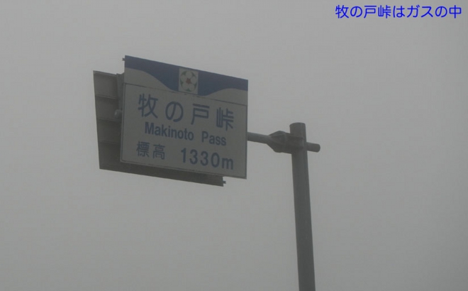 バスはわずか10分の乗車で牧の戸峠まで標高差300mを駆け上がるが、登るにつれてガスが濃くなる。905登山開始、沓掛山手前の展望台までは舗装された遊歩道だが斜度が強くて息が上がる。歩き出して25分で沓掛山に至るが、完全にガスの中で周囲の眺望は360度真っ白である。