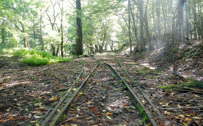 芦生研究林は日本海に注ぐ由良川の最上流部にある。南丹市美山町を過ぎ、狭い県道38号線を遡って行き730駐車場着。併設するトイレは清潔に掃除されており「駐車料金は¥500」との張り紙がある。その指示の通り、ポストに100円玉5個を投入し747出発、橋を渡ると京大研究林入口だ。予め用意した入山届けをポストへ提出し構内に入るとすぐにレールが目に入った。レールは車庫に引き込まれており、その手前に原動機の付いたトロッコと貨物車が連結された状態で放置されている。とても動くようには見えず、レールも赤く錆びついており長く動いていないことは明らかだ。なぜ撤去しないのか不思議に思いながら線路を辿る。