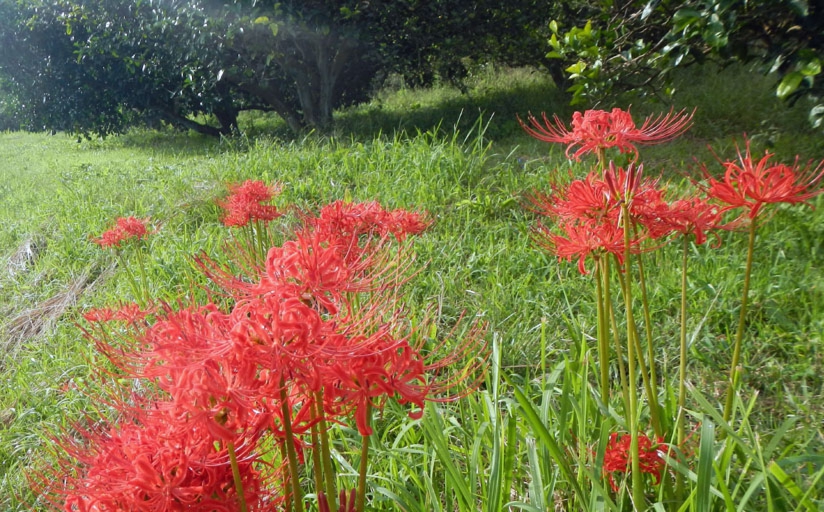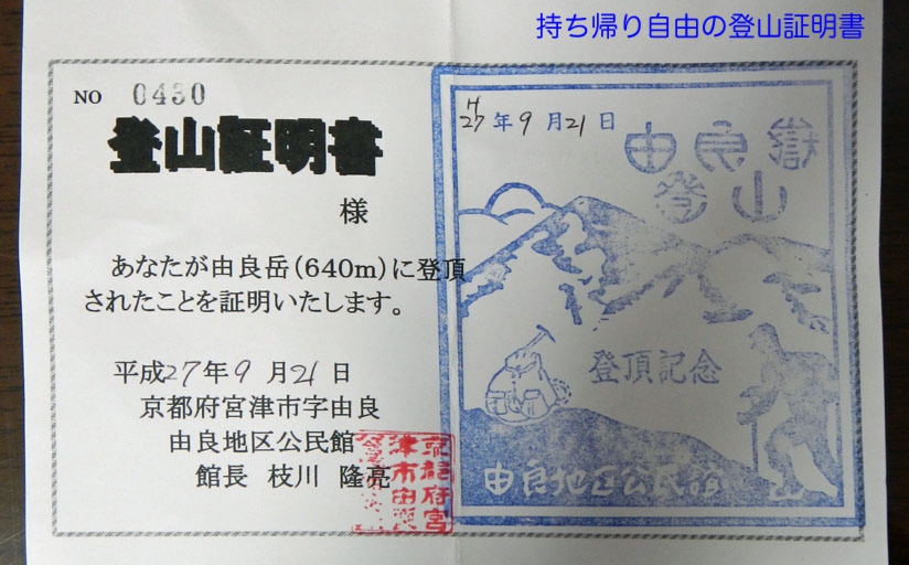 大山崎ICより京都縦貫道を走り舞鶴大江ICで降りる。今年の春にこの高速道路が全通し、舞鶴方面へのアクセスが格段に向上した。北近畿タンゴ鉄道の丹後由良駅には710着、無人駅の駅前広場に適当に駐車する。今回のテーマはSea to Summitなので、まずは山に背を向けて由良海岸を目指し、10分足らずで砂浜に至る。海水に「ペチャ」と手を浸し、回れ右(727)。のどかな田舎道を行くと彼岸花が毒々しい色で咲き誇っている。748登山口に到着、「山の案内所」という小屋があり、登山証明書が用意されている。「ご自由にお持ち下さい」とあるので、登山前ではあるが一枚ゲット。