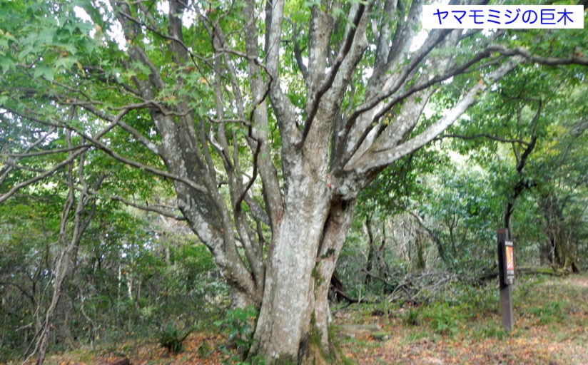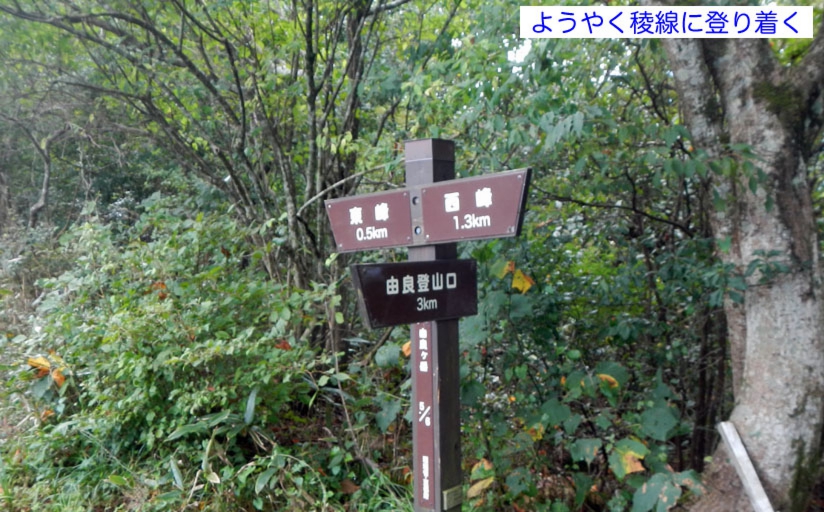 751獣除け柵を通過し登山開始。登山道は花崗岩の尾根につけられており、雨水に浸食され深くえぐられている。非常に狭い場所、段差の大きな場所が多く歩きにくい。822炭焼窯跡を通過し、林道を二回横断する。858一杯水分岐、908ようやく稜線に登り着く。ここまでのルートはかなり急な登り一辺倒で汗だくだ。低山と思って少しナメていた。さて、由良ヶ岳は双耳峰の山であり、まずは三角点のある西峰へ向う。稜線までの登りとは一転してなだらかな尾根道を進む。ヤマモミジの大木を過ぎ、928西峰着、三角点に「ペタ」とタッチし、Sea to Summitを完遂。