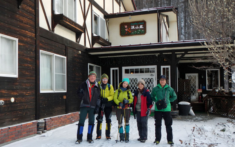 スノーシュウはここまでで終わり、軽アイゼンに付け替える。前日見物した善五郎の滝を経由して観光センターに戻り、レンタル品を返却した。ペンションで入浴するメンバーと別れ1430帰途につく。三連休最終日であったが、渋滞に巻き込まれることもなく20時に高槻に帰着した。初めてのスノーシュウ体験は雪のコンディションが良かったこともあり、思ったよりも楽に歩くことができて快適であった。歩行中は降雪、風もなく暑いくらいで特別な装備も不要であったが、雪山を舐めてはいけないと自戒しつつスノーシュウの購入を考え始めている筆者である。