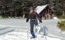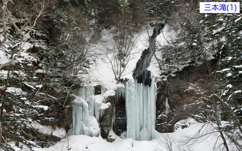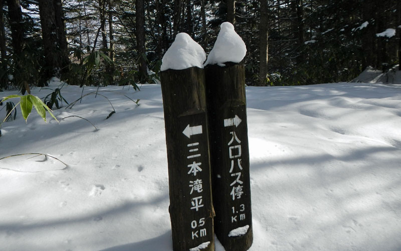 朝風呂を使い、830出発。前夜に雪が降り、パウダースノーが積もっている。スキー場からリフトを二本乗り継いで三本滝レストハウスまで一気に登る(楽チンである)。レストハウスにてスノーシュウを装着するが、初めてなので構造が分からず手間取る。935出発、三本滝を目指す。昨夜の雪でトレースが無く、全くの新雪を踏みしめて行く。スノーシュウは長さ50cm、幅20cmほどの大きさで、言って見れば靴底に広い板を貼付けた感じである。案外歩きやすく、特に苦労することもなく進むことができる。積もった雪と「広い板」のお陰で、登山道の小さな凸凹や段差も平地のように歩けるので、むしろ楽である。ただし踏面の狭い階段などでは横向きに登降しなければならない。