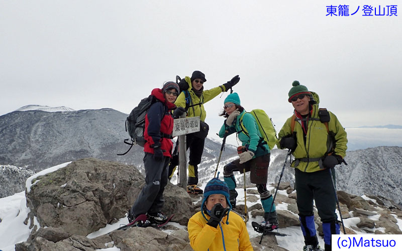 高峰温泉の朝食は宿泊者一斉で8時からである。おかずが少ないが、お櫃と味噌汁をお代わりして山行準備を整える。余計な荷物を宿に預け855出発、玄関前からスノーシュウで歩き出す。まずは水ノ塔山を目指す。順調に高度を上げ、岩場に出た時点で軽アイゼンに履き替え1020山頂に立つ。素晴らしい展望で八ヶ岳、北アルプス、中央アルプス、富士山まで見える。山頂は風が強くかなり寒い。体感温度は-10°Cほどかと思われる。ここからは稜線歩きで、次は東篭ノ塔山(篭ノ登山)に向かう。