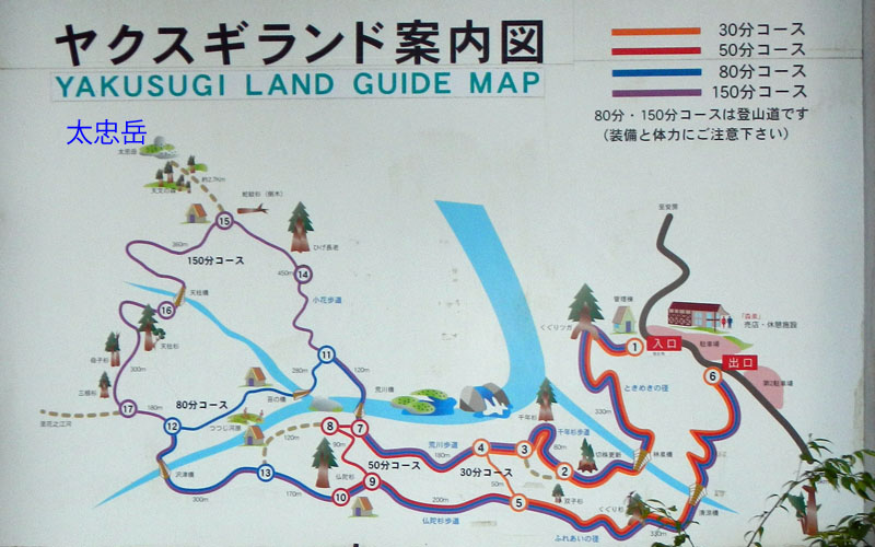 ヤクスギランドNo15ポイントには1020到着、わずか1時間25分で降りてきた。湿度が高かったせいか、汗だくで全身ずぶ濡れ状態だ。分岐点にある東屋では一人の青年が休憩しており、これから太忠岳に登ると言う。しばらく話をすると一昨日は本富(モッチョム)岳を登ったそうで、かなりハードだったとのこと。筆者も今回は本富岳か太忠岳か迷ったのだが、皆考えることは同じである。ここで昼食とし1043出発、ヤクスギランドの150分コースを進み、1133駐車場に帰着した。