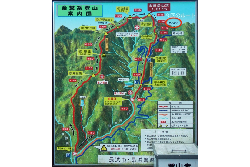 滋賀県第二の高峰である金糞岳は、麓の高山キャンプ場からのアプローチでは登りだけで8時間ほどを要す奥深い山である。日帰りではかなり厳しい山だが、付近を通る林道を利用すれば、簡単に山頂に立てることに気付いた。駐車場からわずか一時間のお手軽ハイキングとなる。