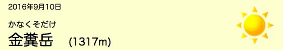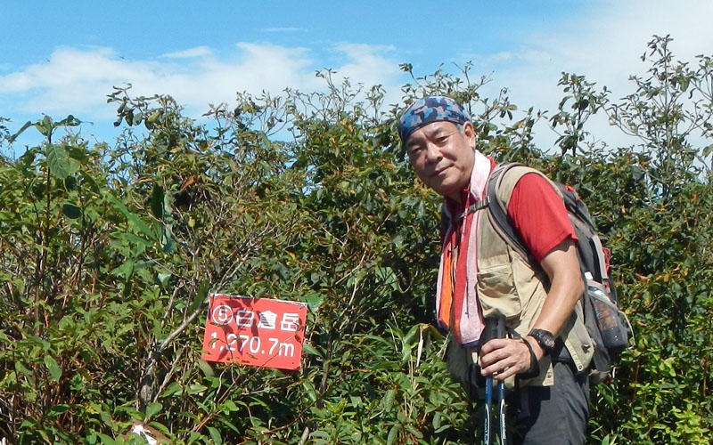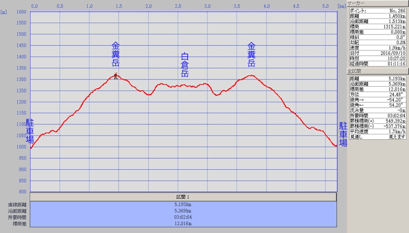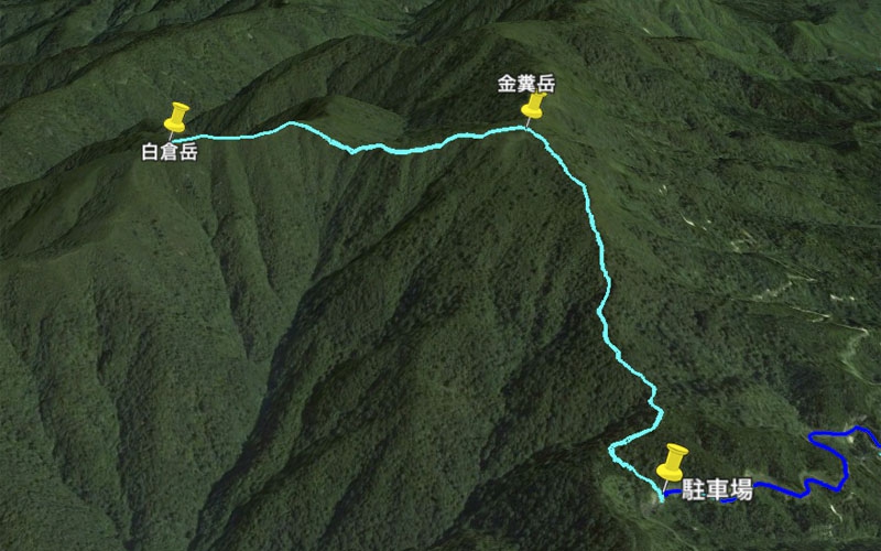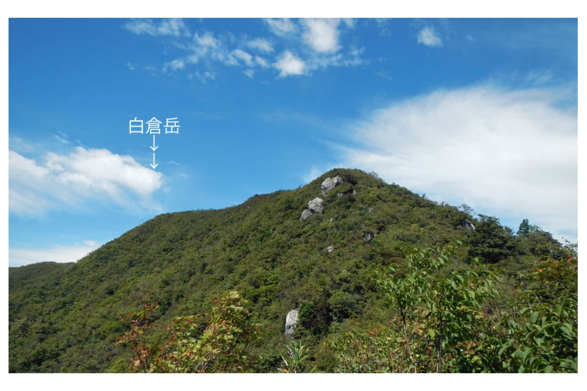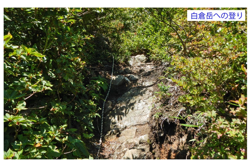 金糞岳から白倉岳への稜線は笹の生い茂る尾根道で、眺望は素晴らしいが日陰が無い。一旦下り、岩場を登り返す。ロープが設置されているが、それに頼る必要もなく高度を上げる。登り着いたと思ったら偽ピークで、白倉岳は10分ほど先であった(1110着)。天気は良好で日射しが強く、陰が無いので休憩する気分ではない。来た道を引き返し、再び金糞岳を通過し1220駐車場に戻った。