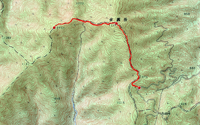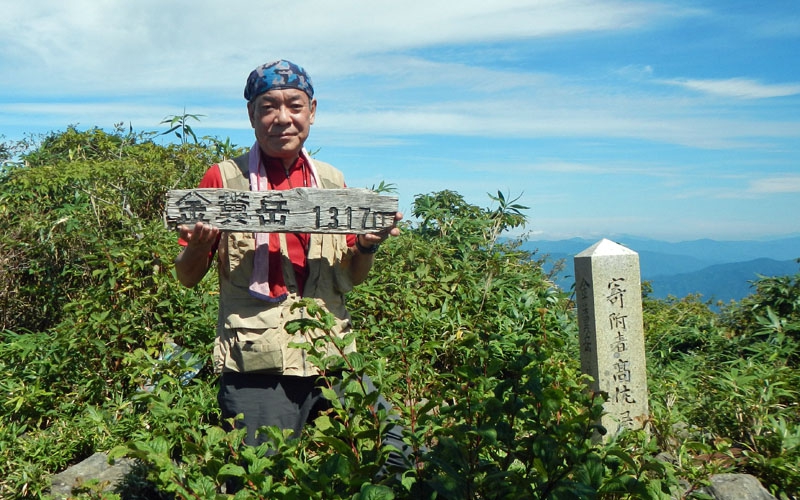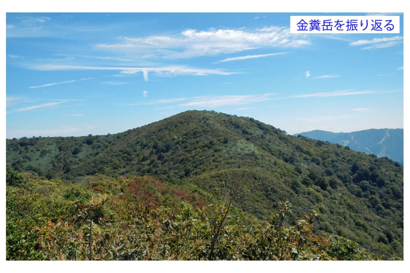 「金糞岳」?と書かれているらしい案内標識があるが、「金」以外の文字は薄れて読めない。この先も道標はほとんど無いが踏み跡はしっかりしている。急坂を経て尾根に上がると平坦な道が続く。「頂上まで25分」の標識が現れると急な登りとなる。段差の高い岩まじりの道を我慢して登り、傾斜が緩むとあっけなく山頂に到着(1025)。冷凍した「即攻元気」を飲み、隣の白倉岳を目指す。
