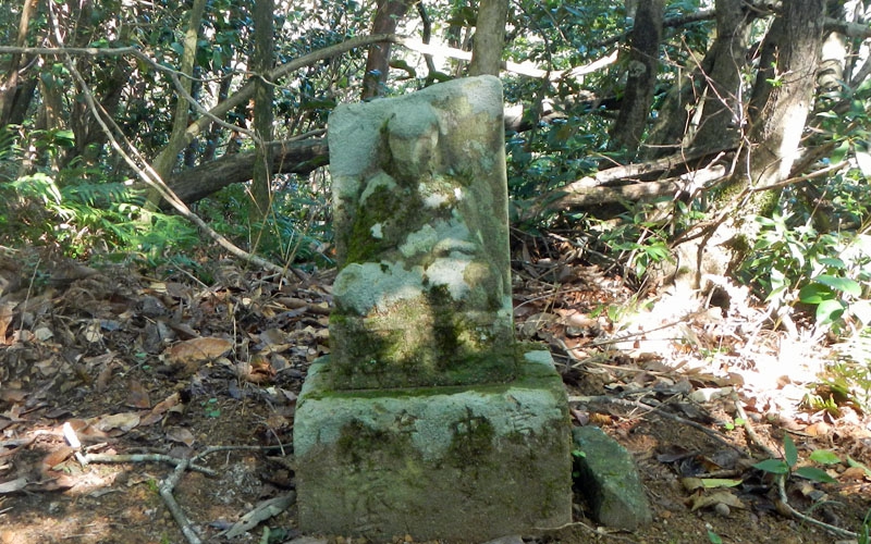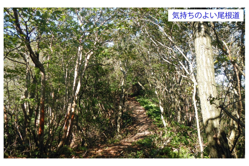この先は少しの登りで「304mの頭 山頂まで55分」標識が現れ道は下り坂へと転じる。気持ち良い尾根道で標高を50mほど下げる。935「中間点 山頂まで45分」標識から再び急登となるが、順番に現れる石仏の写真を撮りながら進むと、ちょうど良い休憩のインターバルとなる。1019山頂直下の展望台に到着、ここからの眺めは素晴らしいの一言で日本海に注ぐ円山川の河口が望める。山頂付近にはたくさんのアンテナが建っており車道も通じている。docomo中継所の脇を進み、広場にて昼食休憩とした。