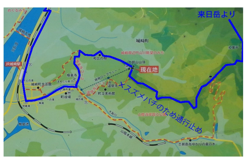 高槻を530出発、北近畿自動車道を八鹿氷ノ山ICで降り豊岡方面へ走る。円山川沿いの県道3号線を山陰本線と併走しながら城崎手前の来日BSに815到着した。事前に駐車場情報を検索したが、適当な場所が見当たらないのでバス停横の空地にクルマを停め830出発。「いらっしゃいませ城崎温泉」の看板が登山路入口である。JR線の宮代川橋梁をくぐり、獣除け柵を開けて山に入る。