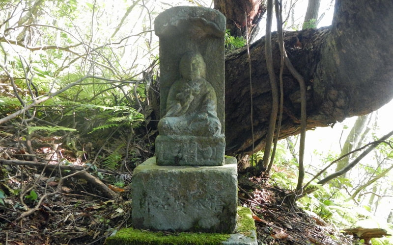 登山道入口では石仏二体に迎えられる。今回ルートは「石仏の道」であり、登山道脇に高さ50cmほどの小柄な石仏が多数点在するのを拝みながら歩く。道は最初から急登で、ウォーミングアップを兼ねてゆっくり歩く。10分ほどで「山頂まで88分」とのキリの悪い数字の標識を見送る。912「天望(展望ではない)」という名の開けた場所に登り着く。眼下に円山川が見え、向かいの山々は雲海の上に望める素晴らしい展望だ。しばし風景にみとれ、写真に収める。