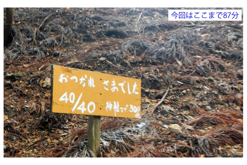 清滝からの登山ルートはコースタイム160分となっているが、何分で登れるかを毎年記録している。その数値は年々悪く(遅く)なってきており、今回は特に記録を意識して臨んだ。途中、一度も休憩することなくひたすら頂上を目指した結果、87分で登頂することができた。過去の最短時間に並ぶことができた。これは天気に恵まれ、登山に快適な条件となったためでもある。