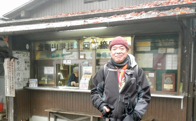 最後の急坂を登り葛木神社に到着。金剛山の最高地点はこの神社の境内にあり、残念ながら近づくことはできない。神社に参拝し、北へ進むと「金剛山登拝回数捺印所」なるものがある。毎日登山の人々はここで登山回数を証明してもらう、という仕組みでハンコを押す窓口が二個もある。その事務所前には登山回数記録の木札がずらっと掲出されている。多い人は一万回を越えるらしい。