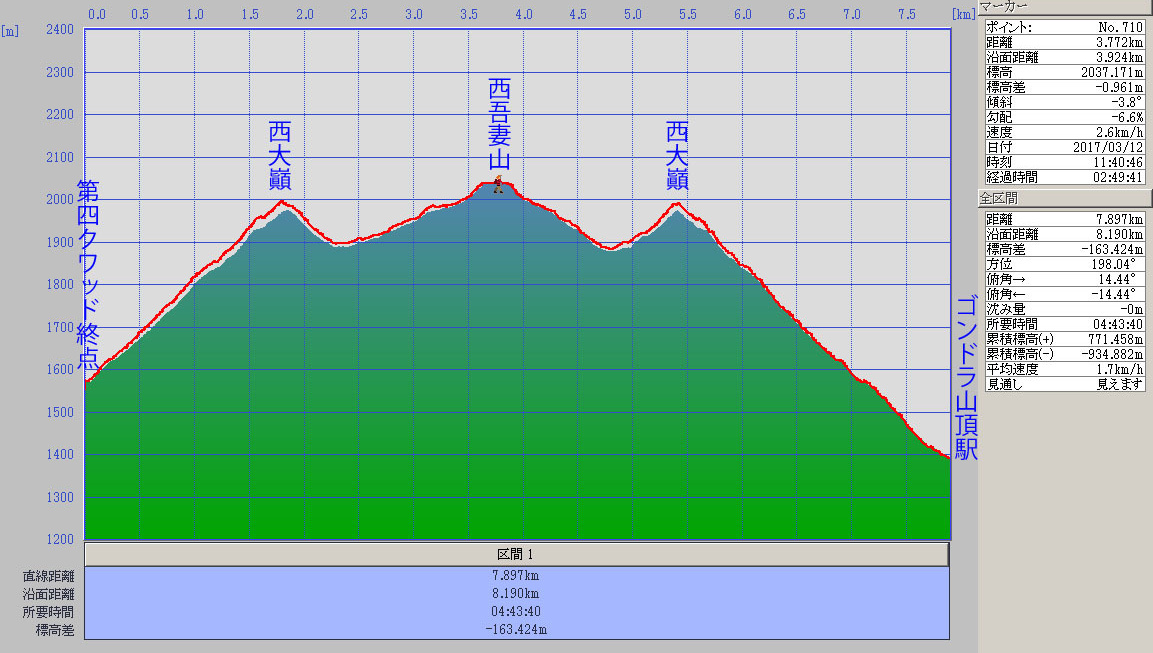 今回はルートをロストしたわけではないが、敢えて薄い踏み跡を辿り西大巓を巻いてトラバースを試みたのだが、途中で雪の状態が悪くなっため、結局西大巓に登り返すこととなってしまった。その後は朝登った道を高速で下った。第四クワッドリフトは下りには乗車できないためゲレンデの端を遠慮しいしぃ下降し1345ゴンドラ山頂駅着。これにて山行は無事に終了した。