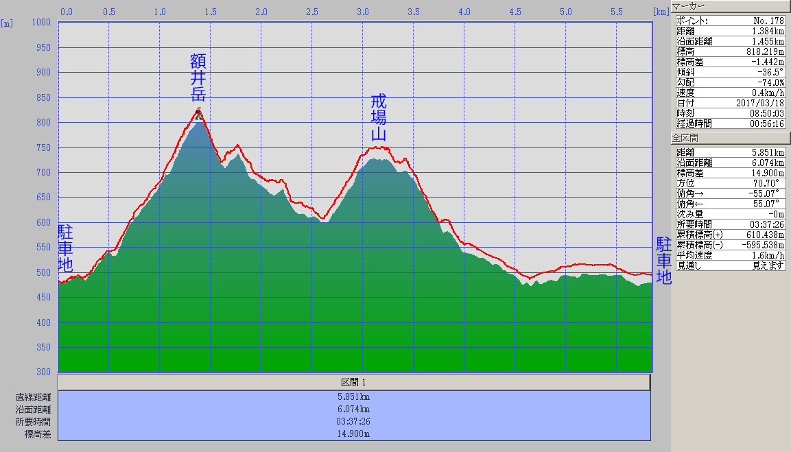 お薦め度=3。ルートは明瞭で額井岳までは道標も完備されている。その先は赤テープ頼りに歩くことになるが、見逃すことはまずない。標高は低いが案外汗を絞られる。特に戒場山への最後の登りはキツイ。出会った登山者は一名。