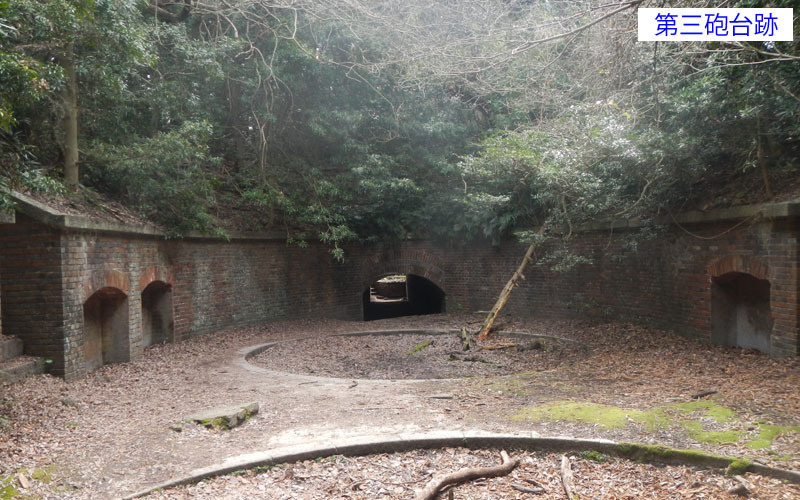 灯台の裏には日本標準時子午線(東経135度)日本最南端の地がある。その後、コウノ巣山の一等三角点を確認し第三砲台跡に至る。この施設は地下3階構造で、今でも実戦使用できると思われるほどの堅固な構造物だ。用意したヘッドランプで地下トンネルを歩いたり、弾薬庫を覗いたり、地上の造作を見学する。明治時代に離島に、しかも人力で築造した様子は、筆者の想像力を完全に越えている。砲台を作るために使われた膨大な労力が無為になったと思うと空しい。続いて同様の構造を持つ第四砲台跡を見て、虎島へ向う。