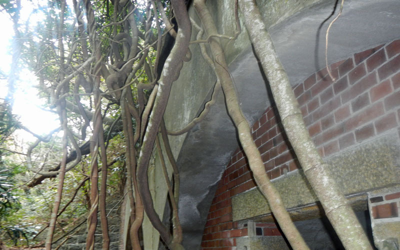 途中、蛇ヶ池を見てから第二砲台跡を経て友ヶ島灯台に920到着。友ヶ島には数多くの砲台跡が残されている。明治時代に建設され第二次世界大戦まで使用されたもので、紀淡海峡を通過する敵艦を攻撃する目的だったが、一度も使用されなかったとのこと。これらはレンガで作られた立派な施設で、現在も健全な構造物だが植物の繁茂で次第に浸食されつつある。その光景が「ラピュタ」に類似しているとの連想から人気があるらしい。