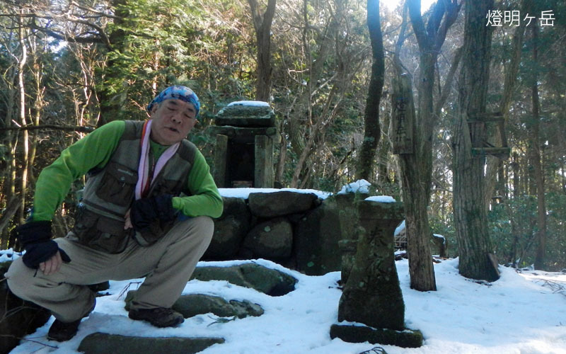 さらに林道を進むと蔵王峠に至る。右折し「鎌のタワ(多輪)」というピークに登る。看板には「葛城経塚二十八宿第18番」とあり、行場のようである。一服していると、割と近い距離から猟銃の発砲音が聞こえてくる。物騒なので早々に蔵王峠へ戻り、再び林道を行く。822ようやく林道から別れて山道に入るとすぐに展望台がある。この辺りから残雪地帯となり、足を踏みしめながら登り831燈明ヶ岳(東の灯明ヶ岳)に到着。