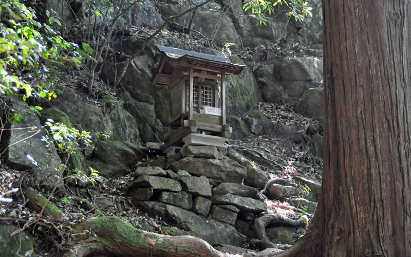頂上に戻り、観音堂を経由して下山開始。途中、谷側へ傾斜した露岩地帯を行くが、お助けロープをつかんで慎重に通過。わずか10分ほどで峠に降り立つ。ここを左折すれば香下寺へ戻れるのだが、宰相ヶ岳に寄ることとして峠を直進。このルートはガイドブックには「踏み跡程度」とあったのだが、それは明瞭な踏み跡で、所々に赤テープもあるので安心して登る。踏み跡に迫る灌木をすり抜けながら高度を上げると952宰相ヶ岳の頂上に飛び出した。一服して峠まで戻り、今度は右折して香下寺へ下る。沢沿いのコースは荒れており、倒木などが散乱している。足下に注意しながらトントン下って1025駐車場に戻った。