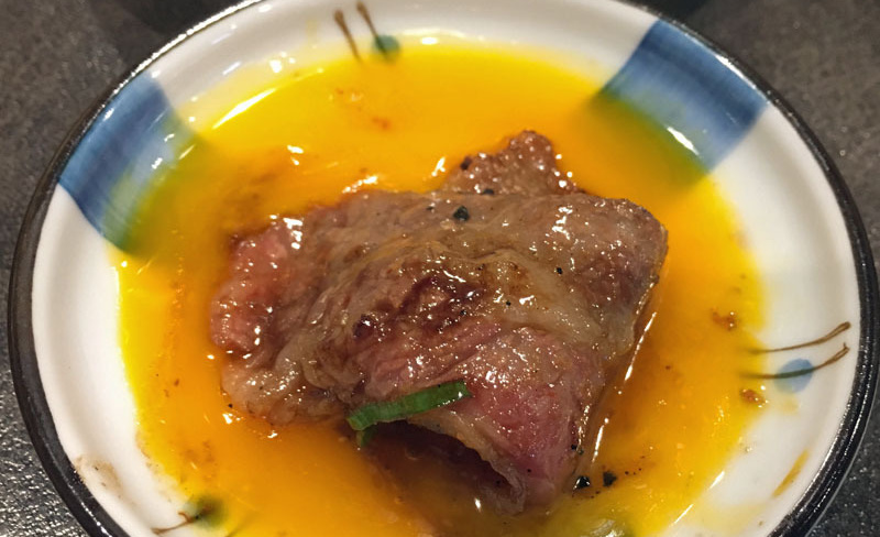 (5) ロース肉 with 卵黄;溶いた卵黄をからめて食べる。スキ焼き以外で牛肉を卵で食べたことは無かったが、一味違った濃厚感が新しい。