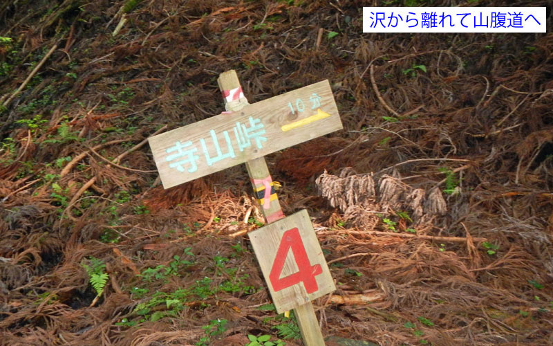 736沢から離れて山腹道で高度を上げる。道は良く踏まれており今のところ迷う心配は無い。744寺山峠に登り着き、今度は下りだ。10分弱で一の谷出合に着き、沢筋の道を上流に向う。一の谷を遡るルートは、何回も徒渉を繰り返す。水量は少ないので特段の問題はないが、ヒルが心配である。821雲取峠に出る。樹木が伐採されており、非常に明るい峠である。少し登った地点で、雲取山へのルートから離れて「雲取山北峰」に登ってみる。この山名は地図には記載が無く、ピークにも手作り標識があるだけだ。しかもそこには「標高約900m」などと自信無さげな数値が書かれている。元のルートに戻り雲取山には851着、山頂は樹林の中で眺望は無い。