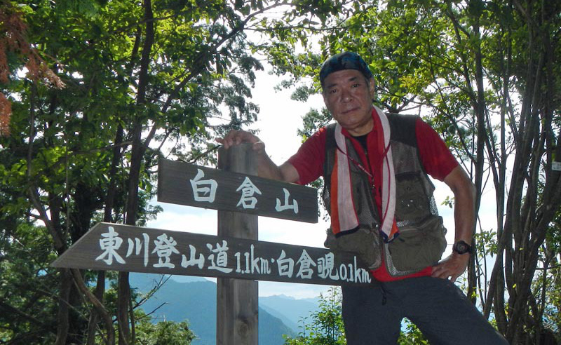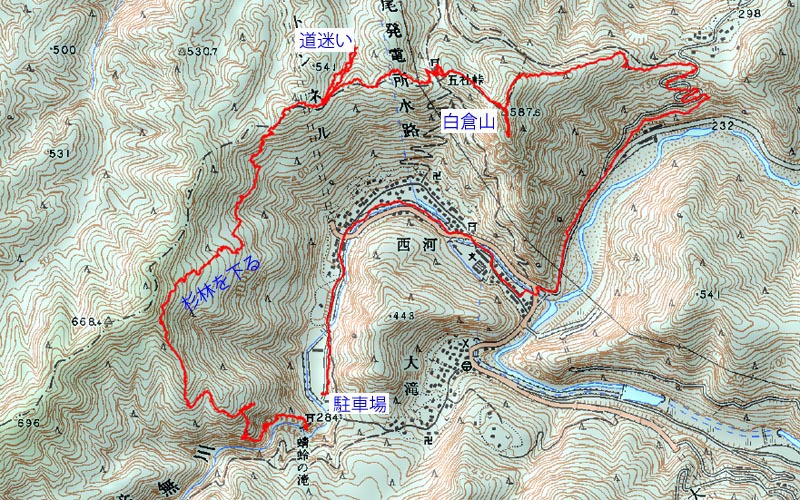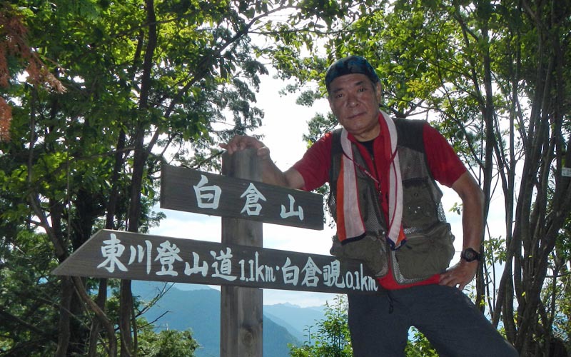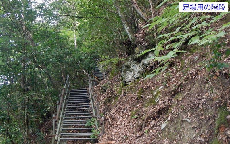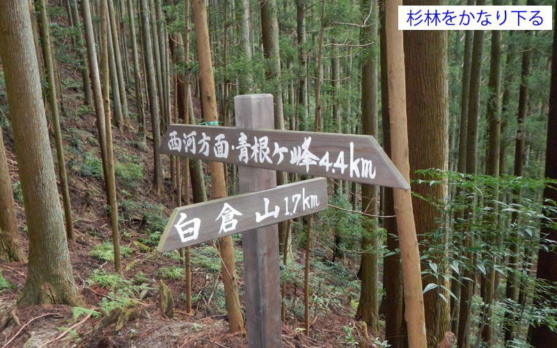 建築現場の足場のような鉄階段で高度を上げ、803旧吉野街道に出る。道標に従って白倉山方面に進むと杉林の中をどんどん下って行く。こんなに下降しても大丈夫か?と不安になると道標が現れる。840王峠に到着、ここから急坂を登ると小さなピークを過ぎる。後から気付いたのだが、このピークが「佛ガ峰」(本日最高峰610m)であった。この後は登降を繰り返し、白倉山への最後の登りとなる。この登りが極悪で、斜度がキツい上に足場が少ない。生えている立木が唯一の頼りで、なかば四つ這いになりながら956白倉山に辿り着いた。ヘトヘトである。