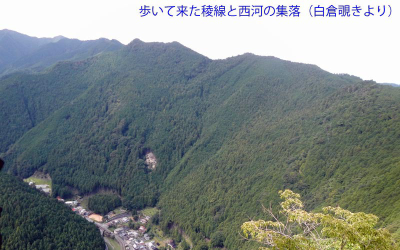 山頂から100mほどの場所に「白倉覗き」なる展望所がある。その下は絶壁なので恐ろしい。昼食を食べて下山にかかるが、非常に歩きやすい尾根道を淡々と下り1039車道に出た。そのまま舗装路を歩き、1115駐車場に帰着。
