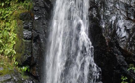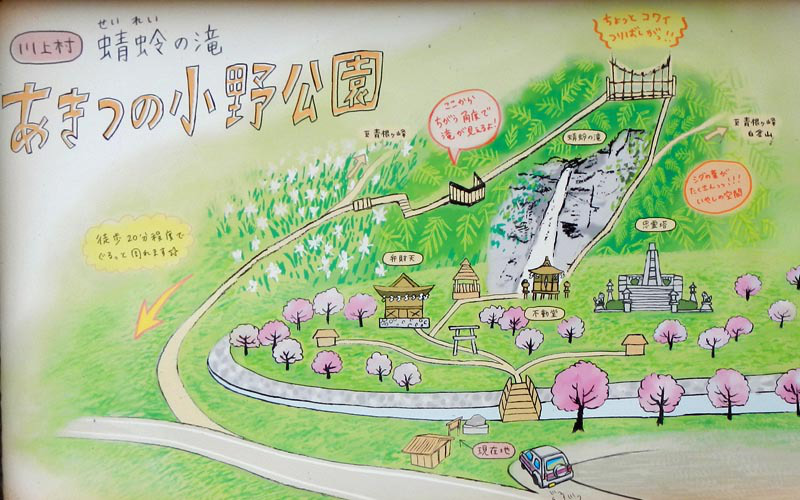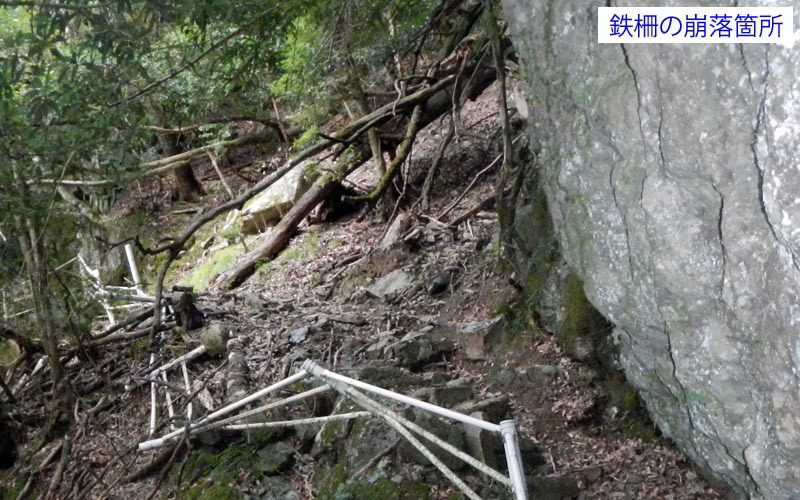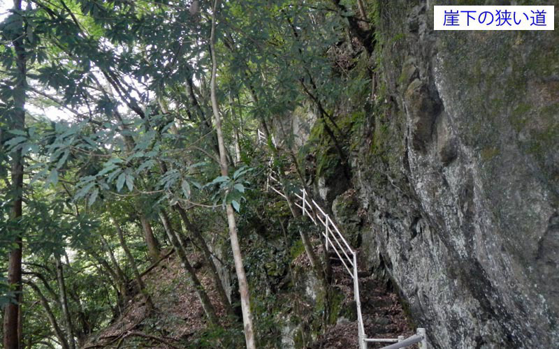 周回コースは蜻蛉の滝(せいれいのたき)駐車場から始まる。整備された公園に入り、蜻蛉の滝方面に石段を登って行く。708観瀑台に着いて驚いた。滝は高さ50mもあり水量も豊富な立派な滝である。ここでFieldAccess2のGPS記録取得を忘れていたことに気付き、あわててスイッチオン。さらに登ると崖の途中に付けられた細い道を行く。転落防止の鉄柵が設けられているが、所々で落石により柵が壊れている。慎重に通過すると「聖天の窟」なる祠がある。ここから先は公園から離れ、登山道に入る。
