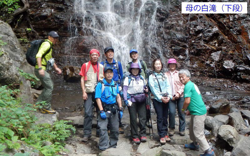 1205下山開始、予定では霜山を経由し河口湖駅へ降りる長いコースをとることになっていたが、より短い「母の白滝」へ向かうルートに変更した。距離が短くなったのは良いが、その分傾斜は急となる。足下は滑りやすい粘土状の道が続き、気が抜けない。慎重に下って1338、母の白滝に到着。立派な滝を見上げて記念撮影。