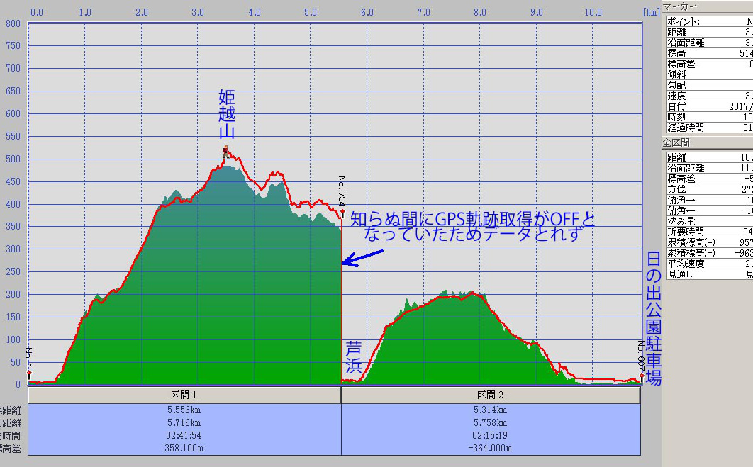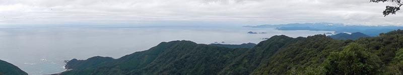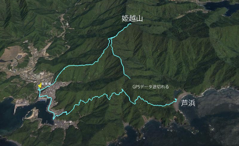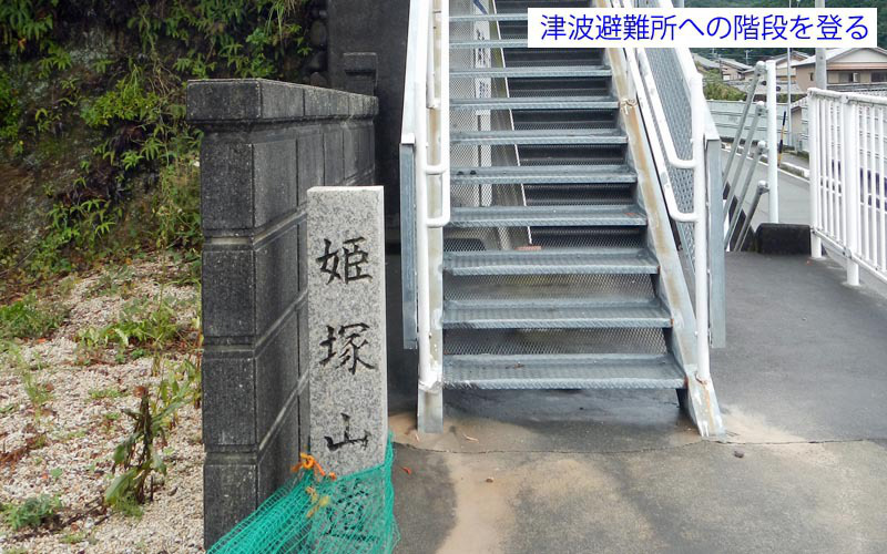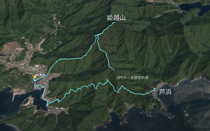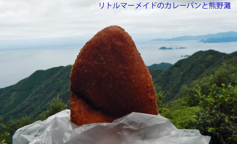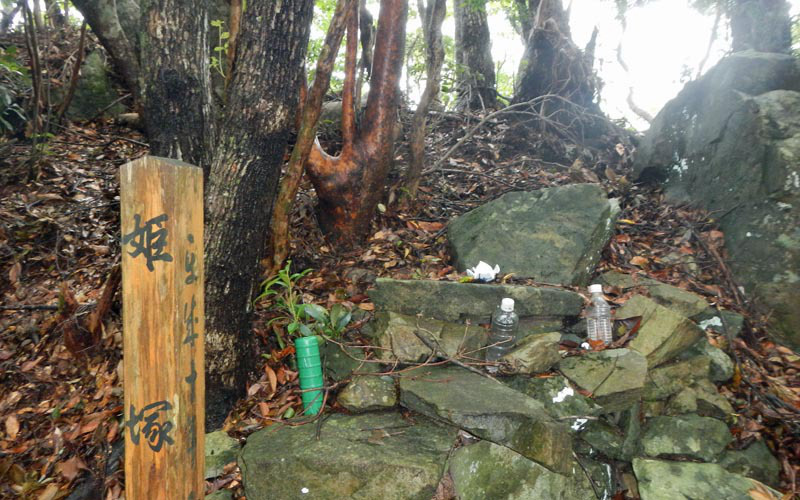 川沿いに行き橋を渡ると尾根の末端に階段がついている。津波避難所への看板があり、登ると標高30mの所に20畳ほどの立派な小屋がある(この地区は昭和19年の東南海地震の津波で大きな被害が出たと言う)。小屋の裏側から尾根をどんどん登る。汗が噴き出すが、湿度高く汗はだらだら流れる。低山ではあるが、海抜ゼロから登るため、案外大変だ。途中、爺塚・姫塚を通り1057姫越山着、眼下に芦浜と熊野灘を望むことができる。高速道路のPAで仕入れたカレーパンを補給し1112出発、芦浜へ向かう。
