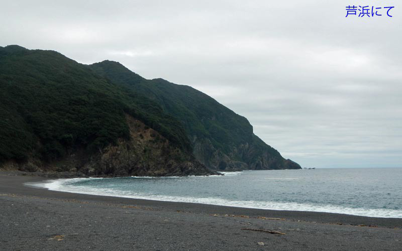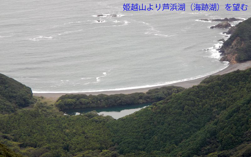 尾根を辿るルートはウバメガシの中を行く。山を歩いていて足下から波の音が聞こえるのは珍しい体験である。急坂でドンドン高度を下げる。朝までの雨で地面が濡れているので慎重に下る。1220芦浜峠に降り立つ。海跡湖*1のある芦浜*2には1234到着、ラーメン休憩とした。
