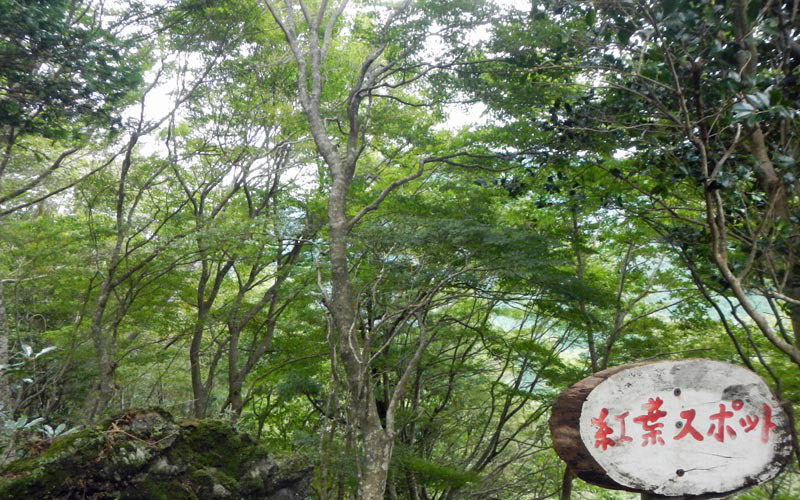 未舗装で湿っぽい駐車場には10台分くらいの区画が切ってあるが、紅葉の時期にはここまでクルマで入る人がいるのだろうか?などと考えながら尾根を登る。20分であっけなく網掛山に到着した(813)。昼食とは呼べない時間だが、朝食がパン一個だったのでかなり空腹であり、ラーメン休憩とした。859下山開始、もみじ谷コースへ向う。山頂より東進し、岩場まじりの急坂を下ると道標があり、もみじ谷に入る。コース上には「紅葉スポット」と書かれた看板が数カ所立っており、見渡すとカエデが多い(現在は緑である)。ルートは明瞭だが、落ち葉や落枝、小石が散乱しており歩く人は少ない様子である。