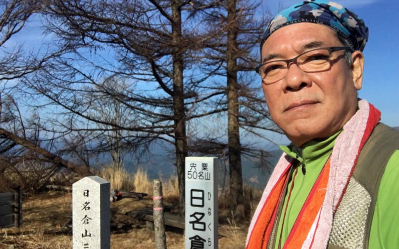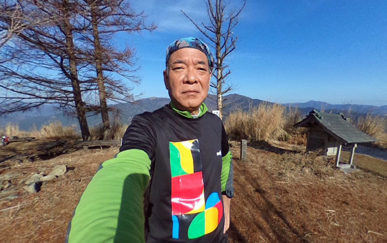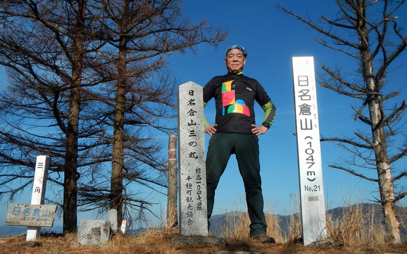 ここからは急坂で高度を上げる。登山道は完全に落葉の下で踏み跡も分からない。テープを探しながら適当に登る。934「一の丸」、940「二の丸」というピークを越え、日名倉山には948に到着した。つまりこの山は山頂付近に三つのピークを抱えているのである。山頂部は広くベンチも数台設置されている。忘れずにオリパラアンバサダー活動(Tシャツを着て写真撮影すること)を行い、即攻元気ゼリーを補給。
